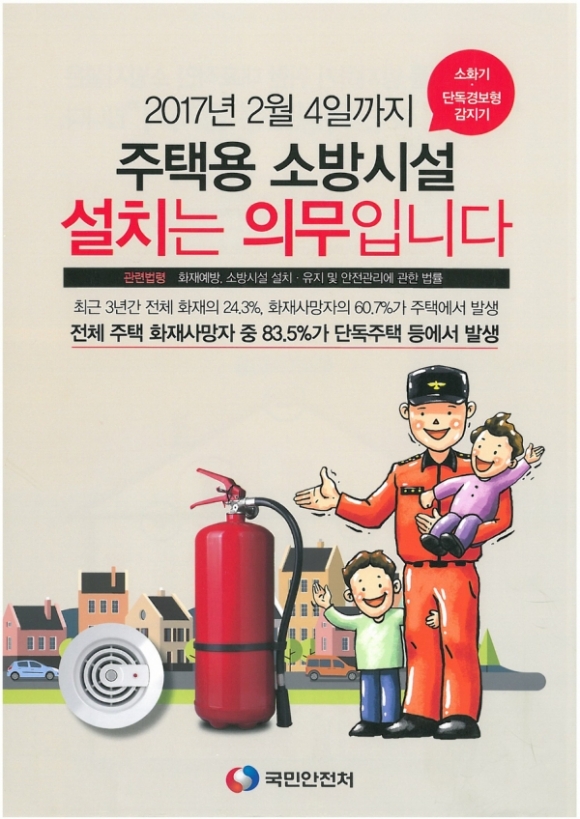 - 일반주택 소화기, 단독경보형감지기, 2017년 2월 4일까지 의무적 설치 -