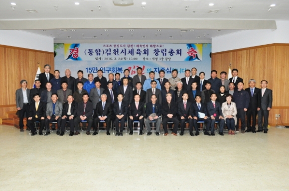 | 김천시는 3월 24일 시청 3층 강당에서 박보생 김천시장을 비롯한 60여명의 대의원이 참석한 가운데, 통합 김천시체육회 창립총회를 개최했다고 밝혔다.