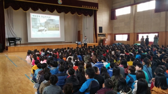 김천경찰서(서장 이창록)에서는, 지난 3월 29일 김천시 동신초등학교 강당에서 전교생 840명을 대상으로 개학철 어린이 교통사고 예방을 위한 '찾아가는 어린이 교통사고 예방 교육’을 실시하였다. 안전한 보행습관을 위한 횡단보도 건너기 5원칙 및 ‘차를 보고 건너요’ 영상을 통한 노래교육을 중점으로 시청각 교육을 통한 맞춤형 교육을 실시하여 학생들에게 교통사고에 대한 경각심을 교육했다. |