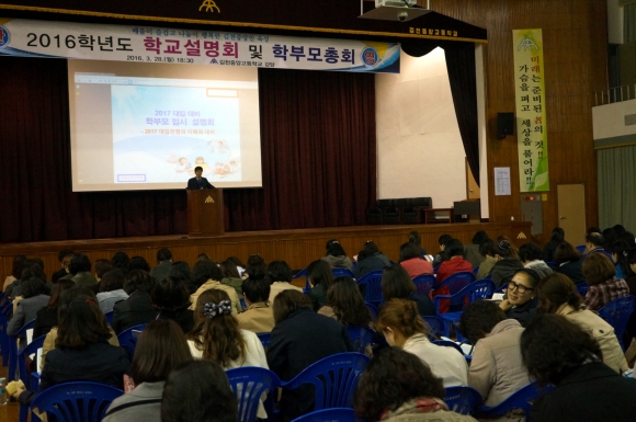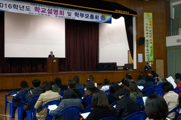 김천중앙고등학교(교장 임규흥)가 지난 28일 강당에서 160여명의 학부모들이 참석한 가운데 '2016학년도 학교설명회 및 학부모총회'를 개최하였다. 이날 설명회에서는 학교장 인사, 교육활동 소개와 학교폭력예방교육, 2017대입전형 특강 순으로 이뤄졌고 학교교육에 대한 이해의 폭을 넓히며 자녀에 대한 정보를 공유하고 교류하는 장이 되었다는 점에서 좋은 평가를 받고 있다. 이후 각 교실에서 담임교사와 학부모의 상담이 늦은 시간까지 이어졌다. 참석한 학부모들은 "아이가 학교생활을 잘하고 있는지도 궁금하고 진학지도도 어떻게 해야 할지 고민스러웠는데 설명회와 담임교사 상담을 통하여 정보도 공유하고 조언도 얻어서 많은 도움이 되었다”만족감을 보였다. 임규흥 교장은 "바른 인성을 바탕으로 하는 경쟁력 있는 미래 글로벌 인재를 키우기 위해 전교사가 힘을 합쳐 노력하고 있다" 며 "학부모와 함께 명품교육을 실현할 수 있도록 학부모와 함께하는 다양한 학부모 참여 활동을 펼치겠다."는 뜻을 전했다.