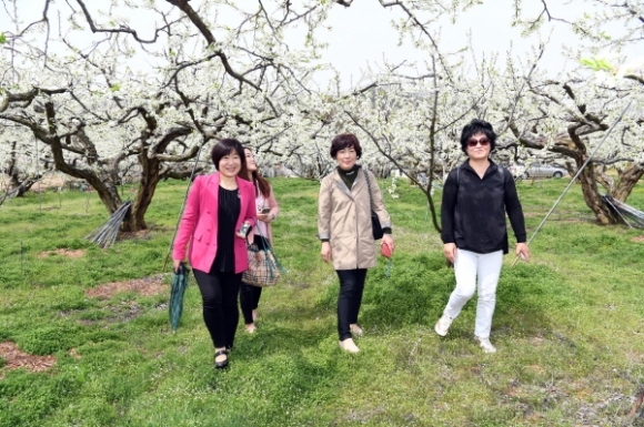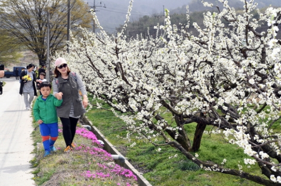 산기슭에 하얀 눈꽃 같은 자두꽃 전경은 전국제일의 명성과 생산량을 자랑하는 김천자두 브랜드가치를 인증 샷 하였다