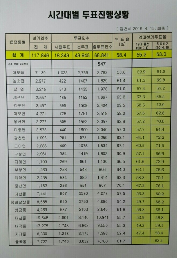 김천지역 총유권자수 117,499명(재외공관제외)으로 투표인수는 68,689명에 58.4%의 투표율을 나타냈다.