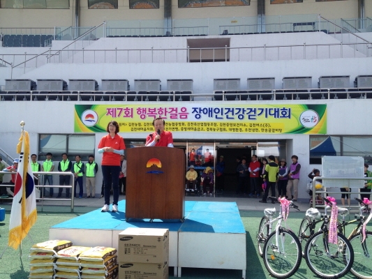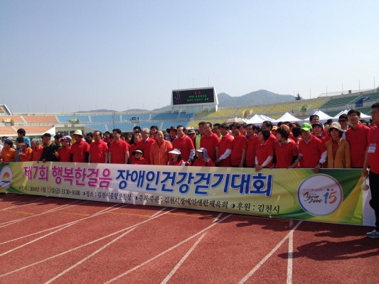 |  | | | ⓒ 김천내일신문 | | 김천시(시장:박보생) 종합운동장에서 지난 4월15일 장애우를 위한 제7회 행복한 걸음 장애인 건강 걷기대회가 박보생 김천시장, 이철우 국회의원, 김병철 시의회 의장을 비롯한 장애인과 가족 등 약 600여명이 참석한 가운데 김천시장애인생활체육회 주최로 성황리에 개최됐다.