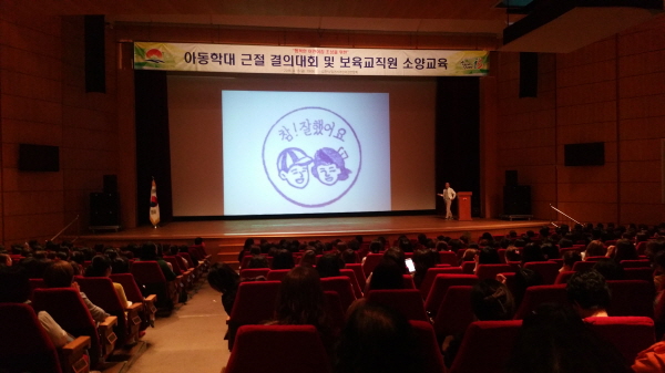 | 김천시어린이집연합회(회장 김만배)는 4. 15(금) 19:00 김천시문화예술회관 공연장에서 어린이집 원장, 보육교직원 5백 여명이 참석한 가운데 아동학대 근절 결의대회를 가진 후 소양교육을 실시했다.