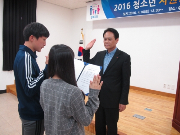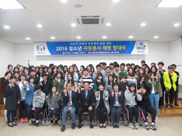 | 김천시(시장 박보생)는 청소년자원봉사자 68명이 참가한 가운데, 4월 16일 중앙보건지소 4층 회의실에서 방문건강관리사업과 연계하여 실시하는 “2016 청소년 자원봉사 체험 발대식”을 가졌다.