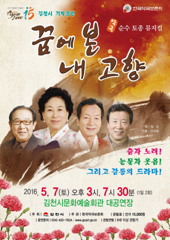 | 김천시문화예술회관(관장 장귀희)에서는 가정의 달, 어버이 날을 맞이하여 절절한 스토리와 구수한 연기가 함께하는 악극 ‘꿈에 본 내 고향’을 오는 5월 7일 토요일 오후 3시, 오후 7시 30분 2회에 걸쳐 대공연장에서 개최한다.