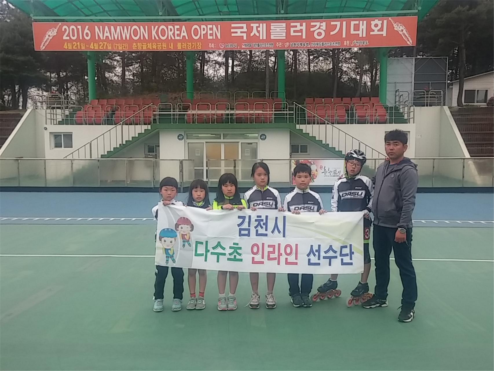 | 김천다수초등학교(교장 김호진) 롤러선수단 6명은 4월 23일(토), 24일(일), 대한롤러스포츠연맹, 남원시 주최, 남원시체육회, 전라북도롤러스포츠연맹이 주관한 2016 남원 코리아 오픈에 참가하여 금 1개, 은 2개, 동 5개의 우수한 성적을 거두었다.