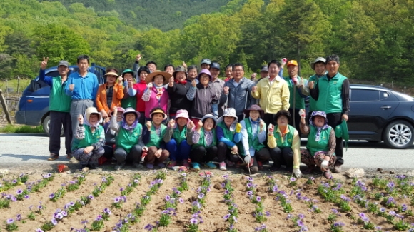 이번에 조성된 꽃밭은 군도19호선 선형개량사업으로 남겨진 자투리땅으로 풀만 무성하게 자라나는 유휴지였으나 금년 1월 새마을협의회 회의에서 꽃밭으로 조성하기로 결정하고 퇴비 살포와 트렉터로 흙을 골랐다.