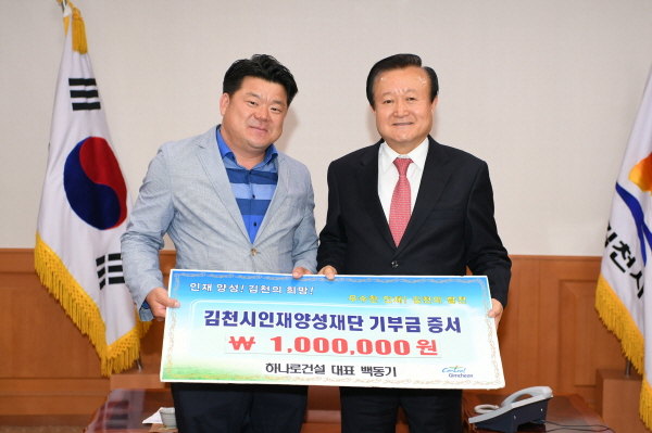 | 김천의 교육발전을 위해 하나로건설(주) 백동기 대표가 지난 4월 26일 김천시를 방문하여 김천시인재양성재단(이사장 박보생)에 장학기금 1백만원을 기탁했다.
