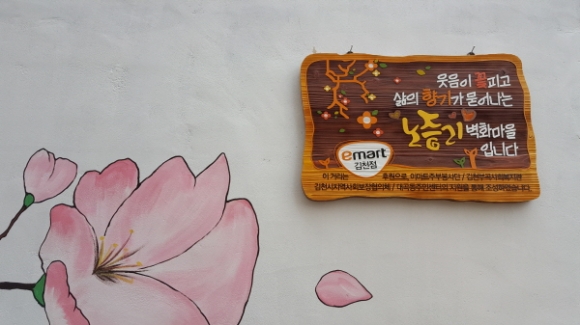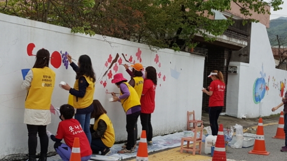 이날은 어두운 골목길을 환하게 해 줄 벽화그리기 뿐만 아니라, 예쁜 디자인으로 현판을 만들어 현판식을 하고, 마을 어르신들에게 경로당에서 국수도 대접하면서 벽화가 다 될 때 까지 행복한 기다림을 함께하는 시간을 가졌다. 김천시지역사회보장협의체와 이마트 김천점은 지난 3월 31일 MOU(업무협약)를 체결하고 희망나눔 프로젝트 사업을 추진하게 되었으며, 월별로 테마를 정하여 지역사회 내 도움이 필요한 소외계층을 대상으로 다양한 사회공헌활동을 하면서 지역사회에 따뜻한 희망을 주고 있다.