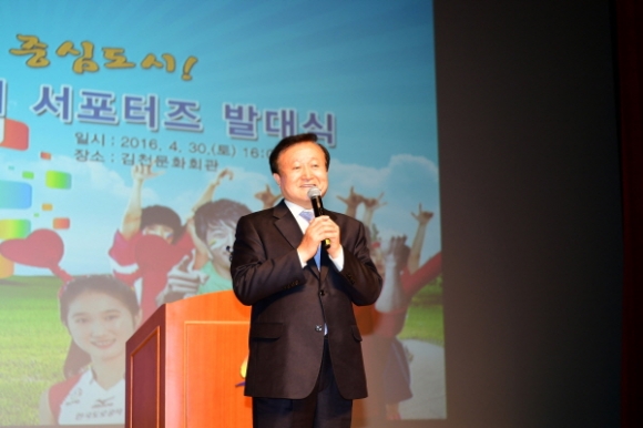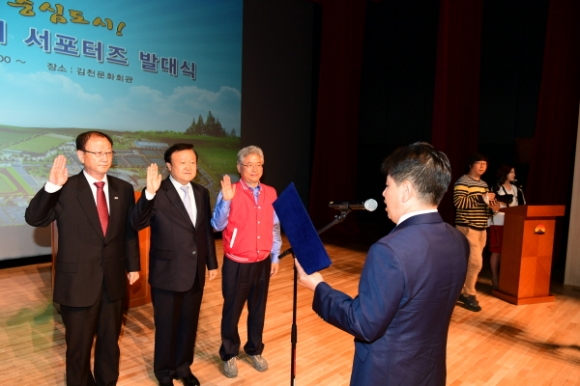 | 4월 30일(토) 김천시문화회관 공연장에서 『Fighting 김천시서포터즈』발대식이 개최되었다. 이날 발대식에는 공모를 통하여 선발된 서포터즈 400여명이 참석했다. 식전행사로 김천시 홍보영상물 상영, 치어팀 공연이 있었으며 인사말, 대표자 선서, 회장단 소개의 순으로 진행되었다.