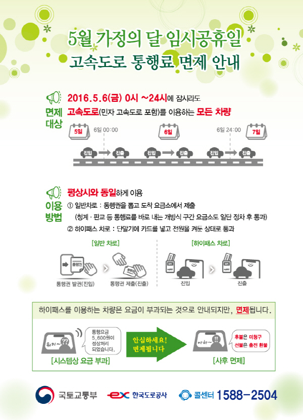 한국도로공사 관계자는 하이패스 통행료가 사후 정산을 통해 면제 되지만, 5월 6일 즉시 면제를 원하는 고객은 통행권을 뽑아 일반차로를 이용하면 된다고 밝혔다.