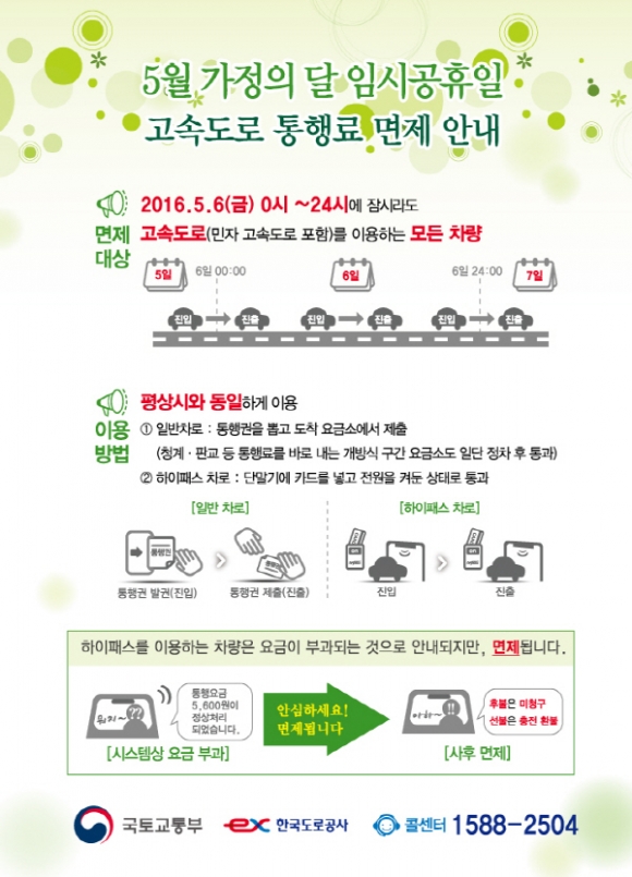 | 한국도로공사는 5월 ‘가정의 달’을 맞이하여 내수 진작 방안으로 임시공휴일로 지정된 6일 00시부터 24시까지 고속도로 통행료가 면제된다고 밝혔다.