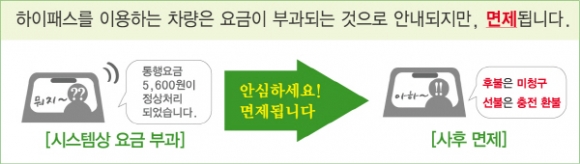 - 일반차로 이용차량은 진입요금소에서 통행권 뽑고 진출 요금소에서 통행권 반납- - 하이패스차로 이용차량 중 후불 카드는 미청구...선불카드는 요금 차감 후 사후 충전-