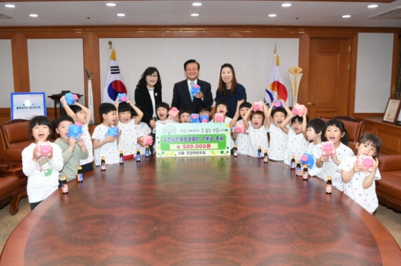 | 지난 5월 10일 모암어린이집(원장 이인숙) 원아들이 시청을 방문하여 우수인재육성을 위한 김천시인재양성재단에 장학금 50만원을 기탁했다.