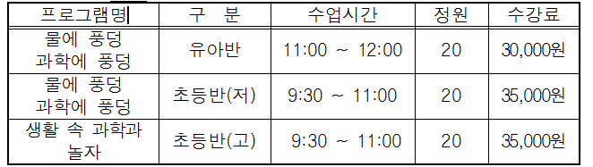프로그램 내용은 유아반은 표면장력 소금쟁이, 꽃잎아 너를 보여줘-모세관 현상, 꽁꽁 안개슬러쉬와 손가락 아이스크림, 무지개 물탑 쌓기이고, 초등저학년반은 깨끗한 물을 만들어요-간이 정수기 만들기, 드라이아이스와 함께 놀아요, 계영배와 신기한 물시계 만들기-싸이펀의 원리, 초등고학년반은 광섬유꽃분수 만들기, 빛의 환타지아, 러브체커, 스파게티 탑쌓기이다. 김천녹색미래과학관 관계자는 “우리 생활과 아주 가까운 물과 빛 등의 과학적 원리를 배우고, 신나고 재미있게 과학과 친해질 수 있도록 지역 어린이들이 많이 신청하기를 바란다.”고 밝혔다.