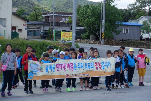 | 아포초등학교(교장 이종배)는 5월 11일 본교 송백관에서 올바른 인터넷 예절을 알리고 아이들이 이를 실천할 수 있도록 올바른 네티켓 캠페인을 실시하였다.