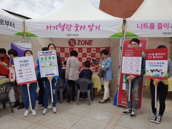 | 김천시 중앙보건지소는 5월 13일 문화예술회관에서 식품안전의 날 행사 지원을 통해 심뇌혈관질환예방과 관리 조기인식 홍보 캠페인을 실시했다.