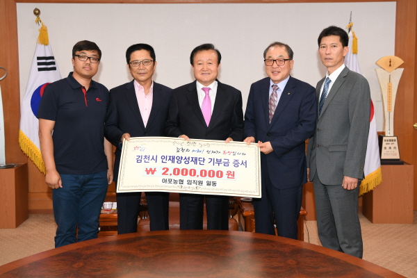 | 아포농협(조합장 배성원), 황금퇴비(대표 박종철), 새금강비료(대표 서경희)에서 5월 16일 김천시청을 방문하여 김천시인재양성재단에 장학금 각 5백만원씩 1천5백만원을 기탁했다.