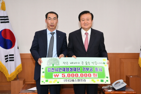 |  | | | ⓒ 김천내일신문 | | 김천시 미래를 위한 우수인재육성과 김천교육발전을 위해 조성 중인 김천시인재양성재단(이사장 박보생)에 (주)디에스엔프라(대표이사 이종열)에서 지난5월23일 김천시청을 방문하여 장학기금 5백만원을 기탁했다.