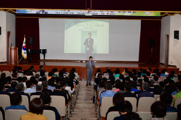 김천시는 5월 24일(화) 오후 4시 평생교육원 대강당에서 이인철 가사법률 전문변호사를 초청하여 ‘재미있고 유쾌한 생활법률’이라는 주제로 김천아카데미 시민교양강좌를 실시했다. 김천아카데미는 김천시가 국내 저명한 강사를 초청 운영하는 시의 대표적 인문․교양강좌로 지난 4월부터 11월까지 총 6회에 걸쳐, 4월을 제외하고는 네 번째 화요일 4시에 개최할 예정이다. 이날 강의에서는 ‘금전대여’, ‘부동산거래’, ‘교통사고’, ‘상속’ 등 우리가 살아가면서 필요한 다양한 생활법률을 사례를 들어 알기쉽고 재미있게 풀어내어 참석자들의 큰 호응을 얻었다.
