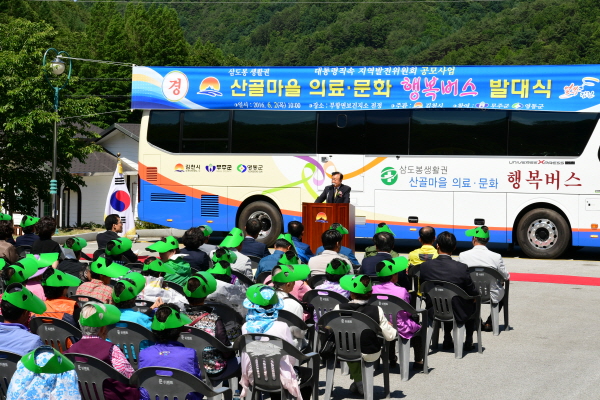 | 김천시는 삼도봉생활권 주민의 의료서비스 향상과 삶의 질 제고를 위한 ‘삼도봉 생활권 산골마을 의료·문화 행복버스 발대식’을 2016년 6월 2일(목) 오전 10시에 김천시 부항면 부항보건지소 전정에서 가졌다.
