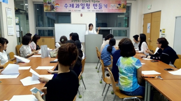 | 김천시 평생교육원에서는 6월 3일(금) 수강생 25명이 참석한 가운데 일일체험학습카페『건강한 수제청만들기』강좌를 시행하였다. 일일체험 학습카페는 평생교육원에서 주최하는 강좌로 시민들에게 다양한 교육과정을 소개, 체험할 수 있는 기회를 제공하고 적성과 소질을 찾는데 도움을 주기위해 마련된 강좌이다. 이날 강좌는 지난 4월 ‘프리저브드 플라워’ 5월 ‘홈메이드 칵테일’에 이어 세 번째로 마련되었다.