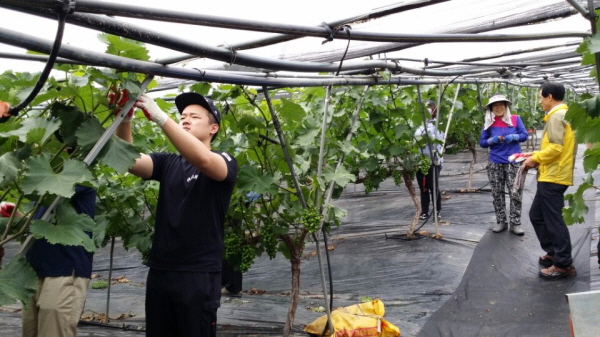 이날 직원들은 포도 알 같이 굵은 땀을 흘리며 포도 순 따기 작업을 했다. 포도밭 주인은 “포도 알, 순 솎기 등을 적기에 작업 하지 않으면 상품성이 떨어지는데 직원들이 일손을 덜어주고 감사하다”라고 말했다.