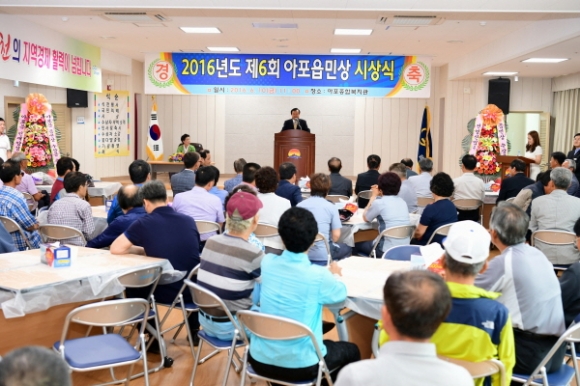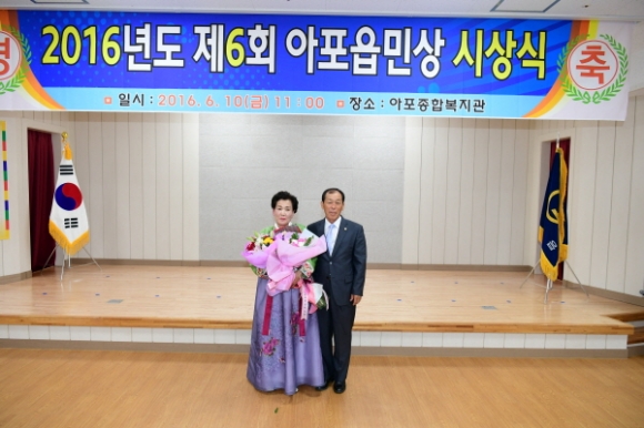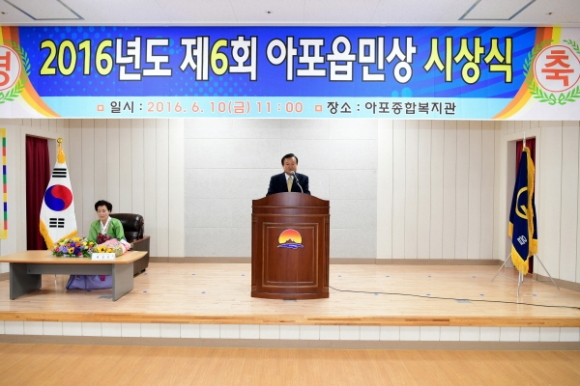 | 김천시 아포읍(읍장 김병진)에서는 읍민화합과 지역사회 발전을 위해 헌신‧봉사해온 읍민에게 수여하는 아포읍민상 시상식을 2016년 6월 10일 아포읍종합복지관 2층 강당에서 개최하였다.