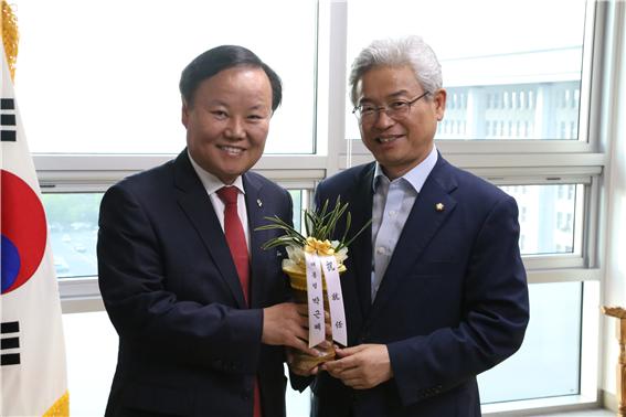 [사진설명=정보위원장에 선출 된 이철우 의원과 대통령 축하난을 전달하는 김재원 수석] |