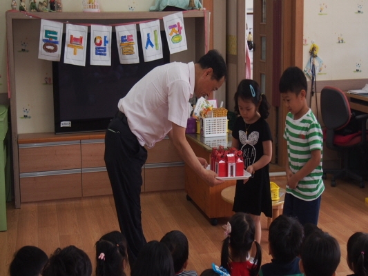 김정범 원장선생님께서는 “김천동부병설유치원 친구들의 작은 정성을 잘 전달하고, 앞으로도 아껴 쓰고 나눠 쓰고 바꿔 쓰고 다시 쓰는 아나바다운동을 잘 실천하길 바랍니다.” 라며 칭찬해 주었다. |