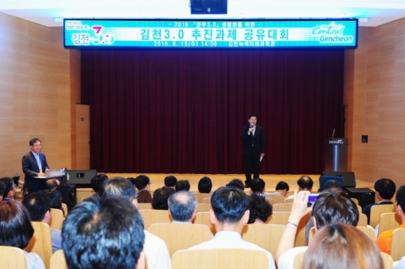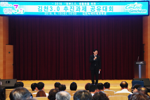 김천시는 6. 15일(수) 오후 2시 김천녹색미래과학관에서 정만복 부시장, 김천시 주요업무 평가위원, 실과소ㆍ읍면동 정부 3.0 담당 공무원 등 120여 명이 참석하여 ‘2016 김천3.0 추진과제 공유대회’를 개최하였다.
