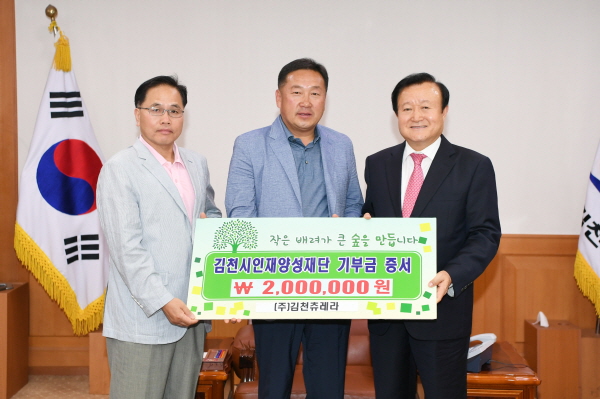 | 김천의 교육발전을 위해 (주)김천츄레라 김천수 대표가 지난 6월 17일 김천시를 방문하여 김천시인재양성재단(이사장 박보생)에 장학기금 2백만원을 기탁했다.