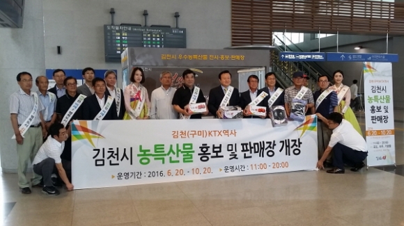 6월20일 개장식에는 박보생 김천시장을 비롯하여, 김일재 김천(구미)KTX 부역장, 편재관 포도회장, 양정규 자두회장 등 관계자 30여명이 참석하였으며, 역사 내에 마련된 김천 농특산물 상설 직거래 판매장은 지역에서 생산된 포도, 자두, 복숭아 등 엄선된 제철 과일과 가공품 등이 판매된다.