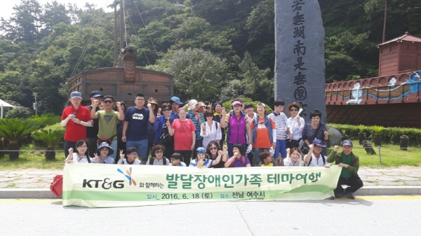 「발달장애인가족 테마여행」은 KT&G 김천공장이 후원을 하고, 김천시지역사회보장협의체의 지역자원 발굴, 연계의 일환으로 경북장애인부모회 김천시지부가 주관하였으며, 발달장애인가족 19세대 43명과 함께하는 테마여행을 개최했다. 이번 테마여행은 전라남도 여수시 오동도로 가족여행을 떠났으며, 평소 몸이 불편하거나 여러 가지 사정으로 여행을 가기가 어려웠던 장애인가족들이 함께 여행을 함으로써 가족사랑을 증진시키는 기회를 제공하였다. 이날 여수시로 여행을 떠난 가족들은 남해바다와 오동도 등대 홍보관, 전시된 거북선과 판옥선을 보고, 여수해양레일바이크도 함께 타고, 산책로에서 산책을 하면서 서로 휠체어도 밀어주는 등 즐거운 시간을 가졌다. KT&G 김천공장은 평소에도 ‘사랑의 김장나누기’, ‘사랑의 연탄나누기’, ‘1사1촌 자매결연’을 통한 마을 지원 사업, 영유아 시설 등 복지시설을 찾아가는 봉사활동, 자연정화활동 등 다양한 사회공헌활동을 지속적으로 실시하면서 지역주민을 위한 복지증진에 앞장서고 있다.