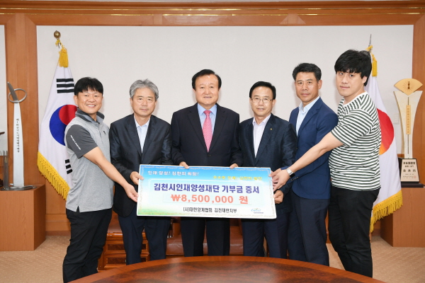 | 김천시 미래를 위한 우수인재육성과 김천교육발전을 위해 설립한 김천시인재양성재단(이사장 박보생)에 (사)대한양계협회 김천채란지부(지부장 오재진)에서 장학기금 8백5십만원을 기탁했다.