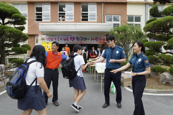 이날 행사는「친구사랑 가득한 행복한 등굣길 만들기」를 모토로 학교와 경찰서에서 준비한 비타민, 밥버거, 음료수 등을 등굣길 학생들에게 전달하며 응원하는 형태로 진행되었다.