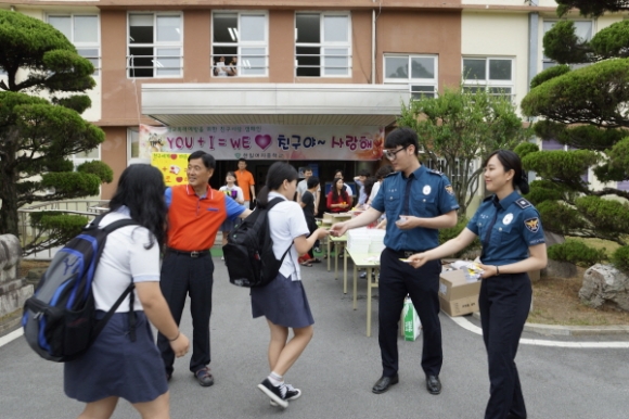힘든 등굣길에 뜻밖의 선물을 받은 학생들은 당황하면서도 즐거운 기색을 감추지 못했으며, 학교전담경찰관과 선생님들의 응원에 힘입어 힘찬 하루를 보내겠다고 화답하였다. |