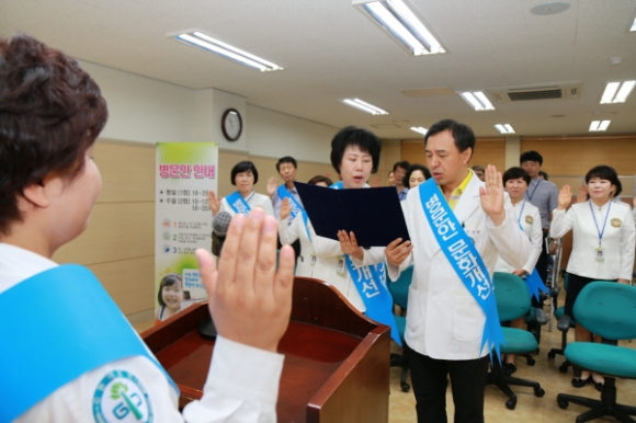 그는 이어 “병문안 문화가 바뀌지 않으면 제 2, 제 3의 메르스 사태는 언제든지 일어날 수 있다”며 “우리 의료원부터 솔선수범해 이 같은 사태가 다시는 발생하지 않도록 모든 임직원이 최선을 다해 캠페인을 펼쳐 달라”고 당부했다.