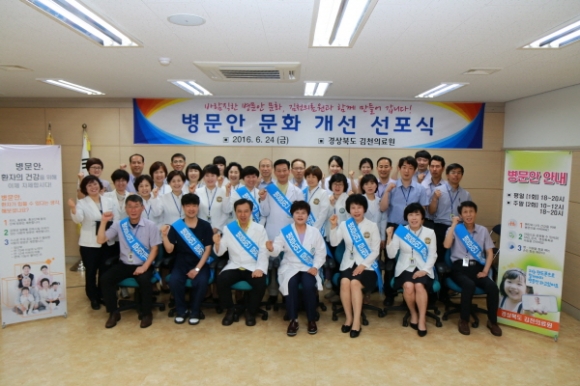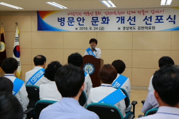 | 김천의료원은 6월 24일 2층 회의실에서 ‘병문안 문화 개선 선포식’을 열었다. 김미경 원장을 비롯해 성연문 진료처장, 전건우 행정처장, 박진열 기획조정실장, 이명희 간호부장 등 임직원 30여 명은 이날 병문안 문화가 개선될 때까지 지속적인 캠페인을 벌여나가기로 했다.