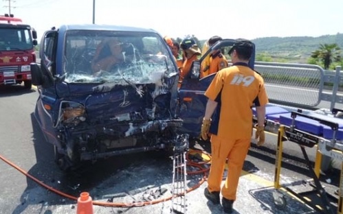 | 김천소방서 출동대가 사고현장에 도착한바, 교차로에서 화물차와 승용차가 추돌한 상황으로 유압 전개기 및 절단기 등을 활용하여 차량 내에서 빠져나오지 못한 부상자 2명을 안전하게 구조하였으며, 현장에서 응급처치를 실시한 후 인근 병원으로 신속히 이송하였다. |