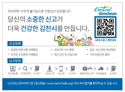 신고방법은 스마트폰을 이용할 경우 QR코드를 스캔하면 바로 신고창으로 이동하며 김천시 홈페이지(www.gimcheon.go.kr)를 방문해 PC로도 제보가 가능하다. 신고자는 신고 후 생성된 고유번호로 레드휘슬 (www.redwhistle.org)웹사이트에서 처리결과를 확인할 수 있다.