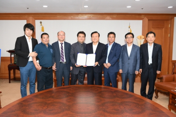 | 김천시는 자동차용 조명등(할로겐 램프)을 생산하는 (주)이케이글로벌과 7월 4일(월) 박보생 시장, 윤준섭 대표이사 등 회사 관계자가 참석한 가운데 시청 접견실에서 투자양해각서(MOU)를 체결하였다.