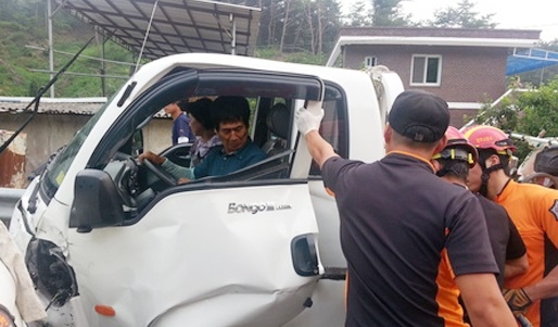 김천소방서 출동대가 사고현장에 도착한바, 트럭 2대와 SUV차량 1대가 추돌한 상황으로 유압 전개기 및 절단기 등을 활용하여 차량 내에서 빠져나오지 못한 트럭 탑승자 2명과 SUV차량 탑승자 1명을 안전하게 구조하였으며, 현장에서 응급처치를 실시한 후 인근 병원으로 신속히 이송하였다.
