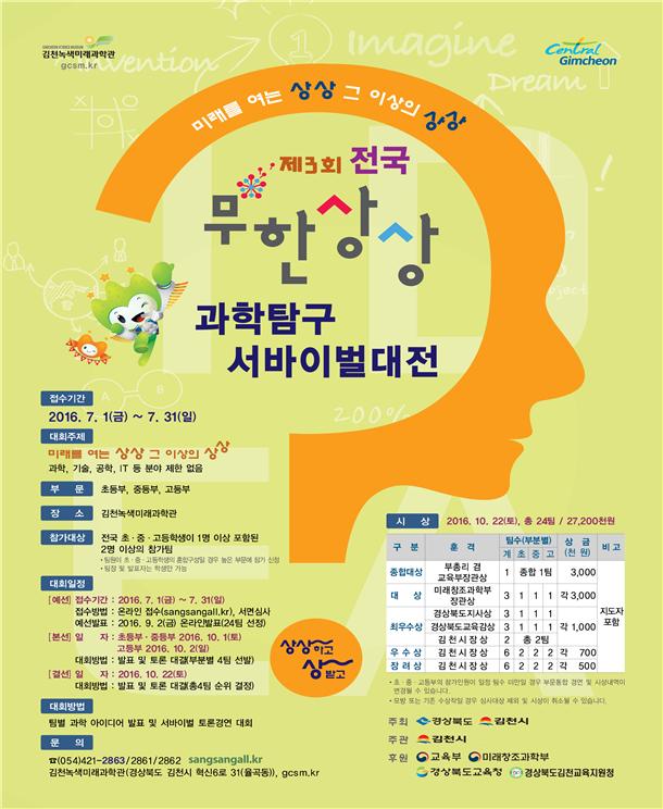 자세한 사항은 김천녹색미래과학관(T:054)421-2863, 070-4154-3890) 및 대회공식홈페이지(sangsangall.kr)를 이용하면 된다.