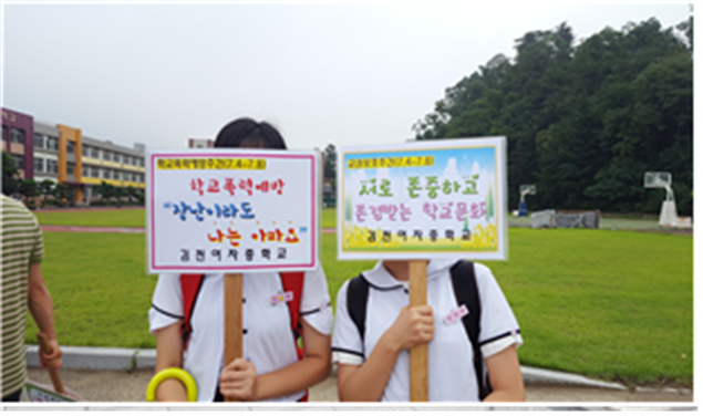 | 김천여자중학교(교장 정우현)는 교권보호 및 학교폭력예방 주간(4일∼8일)을 맞이하여 다양한 사제동행 프로그램으로 사제 간의 정을 돈독히 하였으며, 학생회 주관으로 학교폭력예방을 위해 캠페인 활동을 실시하였다.