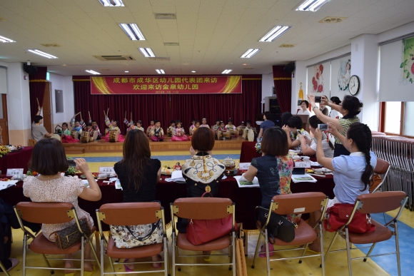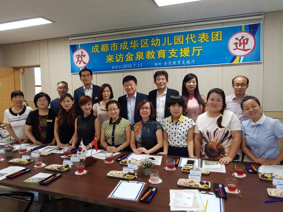 | 김천교육지원청(교육장 장태덕)에 7월 11일(월) 중국 사천성 성도시 성화구에서 유치원 교육단이 내방하였다. 지난 6월 중국 사천성 성도시 교육국과 김천교육지원청(교육장 장태덕)의 교육업무 협약 이후 첫 방문이다. 중국 사천성 성도시 유치원 교육단(교사연수학교 유아교육부주임 주창유 외 8명)은 김천교육지원청 방문을 시작으로 김천유아교육체험센터, 공립 단설 김천유치원과 율곡유치원을 현장 방문하여 김천 유치원의 교육환경과 실태를 돌아보는 시간을 가져 정보공유 및 상호 소통하는 뜻깊은 시간을 가졌다. 장태덕 교육장은 “김천교육지원청과 성도시교육국의 업무협약 ‘평등호혜, 상호보완’에 의거하여 양국 유치원간의 교육협력 관계를 마련하여 정보 및 자원 공유를 실현하며 공동 발전을 할 수 있기를 기대한다.” 고 하였다.