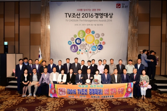 | 박보생 김천시장은 지난달 30일 2016 한국의 미래를 빛낼 CEO 대상에 이어, 7월 20일 서울시 밀레니엄 서울힐튼호텔에서 열린『2016 TV조선 경영대상』 혁신경영부문 대상에 3년 연속 선정되었다. 미래창조과학부, 농림수산식품부, 산업통상자원부, 조선일보가 후원하는「2016 TV조선 경영대상」은 수많은 대내외적 변수 속에서 창조와 혁신능력을 기반으로 새로운 가치를 창출하고 지속적인 성장 발판을 마련한 기업과 자치단체의 리더에게 주어지는 상이다.