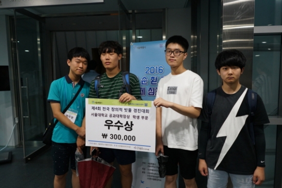 ‘서울시’와 ‘서울대학교 빗물연구센터’가 주최하고 ‘(사)빗물모아지구사랑’이 주관하는 이번 행사는 지난 7월 28일 ~ 31일까지 서울시청 광장에서 열린 ‘물 순환 시민 문화제’의 일환인 ‘2016 제 4회 전국 창의적 빗물 경진대회‘에서 2학년 4반 ‘우결사(雨決師)’ 팀, 편주현, 강현규, 배도현, 이보성 학생이 ‘빗물의 발걸음’이라는 보드게임을 창작하여 우수상(서울대공과대학장상)을 수상하였다.