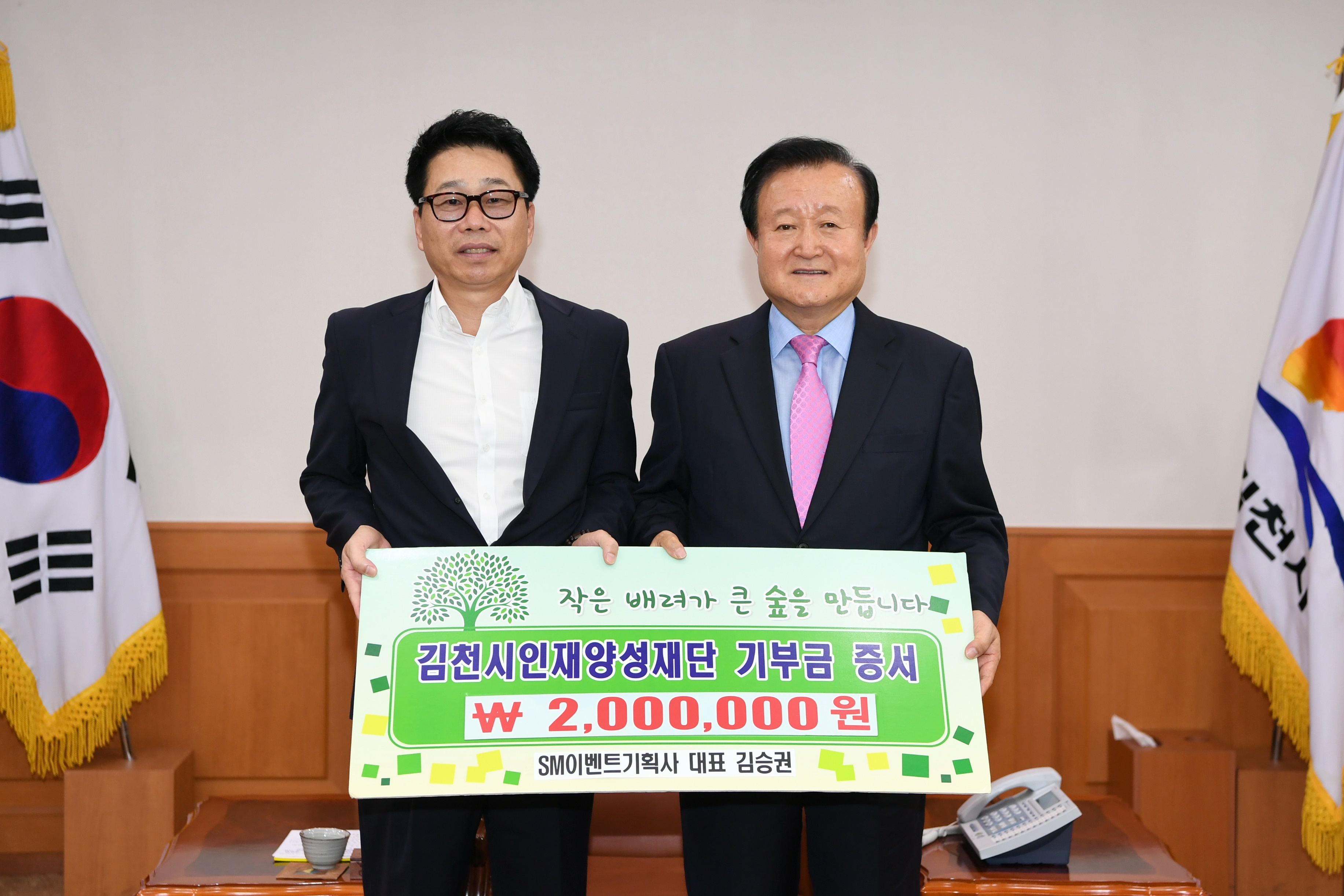 김승권 SM이벤트기획사 대표는 “김천에서 각종 사업을 하면서 시민들로부터 많은 도움을 받고 있으며, 그 고마움에 보답하고자 김천시인재양성재단에 2백만원을 기탁하게 됐다며, 김천의 인재양성에 동참할 수 있어서 매우 기쁘다.”고 말했다.